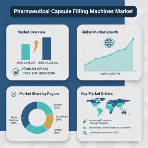 ROCKVILLE, MD, UNITED STATES, October 16, 2025 /EINPresswire.com/ -- The global pharmaceutical capsule filling machines market is expected to grow from USD 646.2 million in 2025 to around USD 1,032.7 million by 2035, marking an absolute increase of USD 386.5 million over the forecast period. This represents a total growth of 59.8%, with a compound annual growth rate (CAGR) of 4.8% between 2025 and 2035. The market is projected to expand nearly 1.6 times its current size, driven by rising pharmaceutical production, increasing demand for precision dosing equipment, and the growing adoption of automated manufacturing processes.